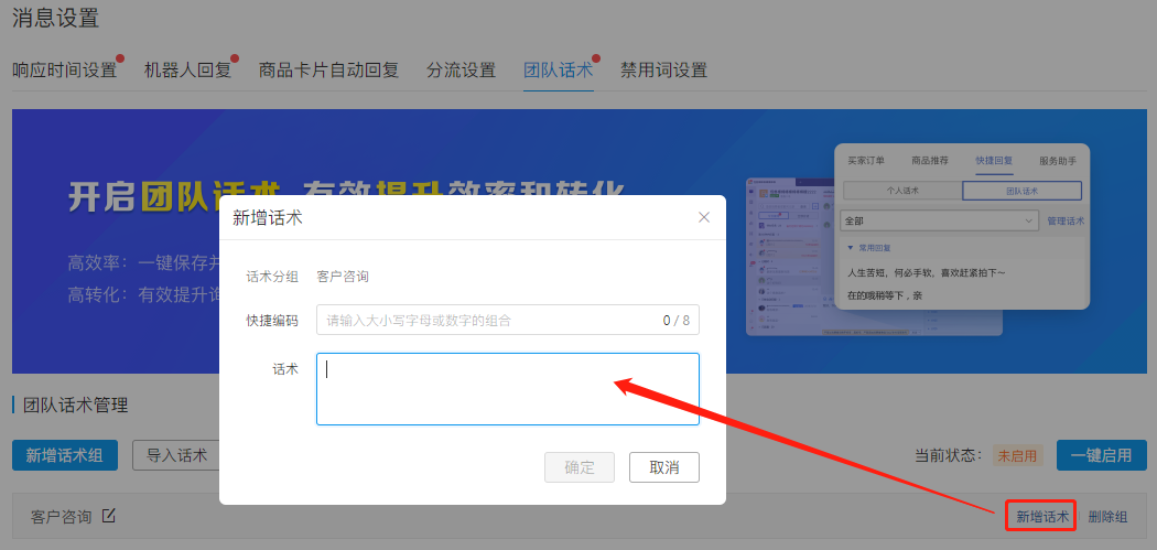第二步:编辑组内话术内容:点击“新增话术”,输入话术文本、支持输入快捷编码。(非必填)