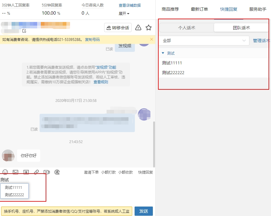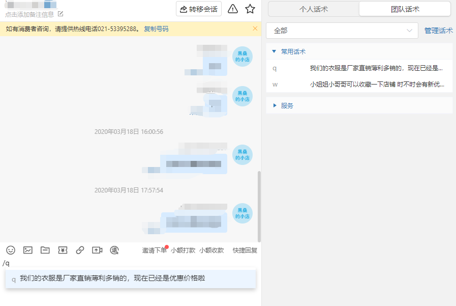 商家管理员统一设置话术并同步至全店客服使用。(温馨提示:目前团队话术功能仅支持在windows商家工作台及web客服平台使用,暂不支持商家版APP。)