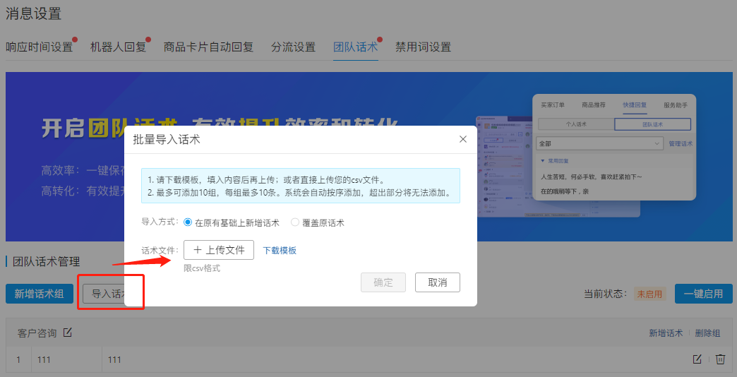 还可以使用“导入话术”,通过csv格式的文件批量导入已维护好的话术。“导出话术”可将在系统设置的团队话术以csv格式的文件导出,以便管理员在excel中维护。