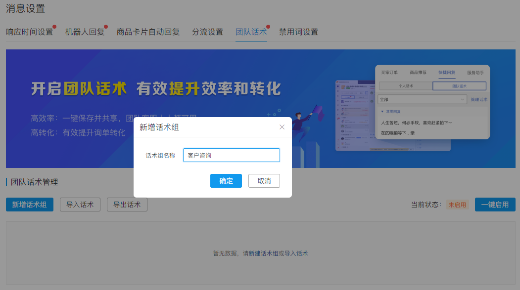步:新增话术组:点击“新增话术组”,填写话术组名称。
