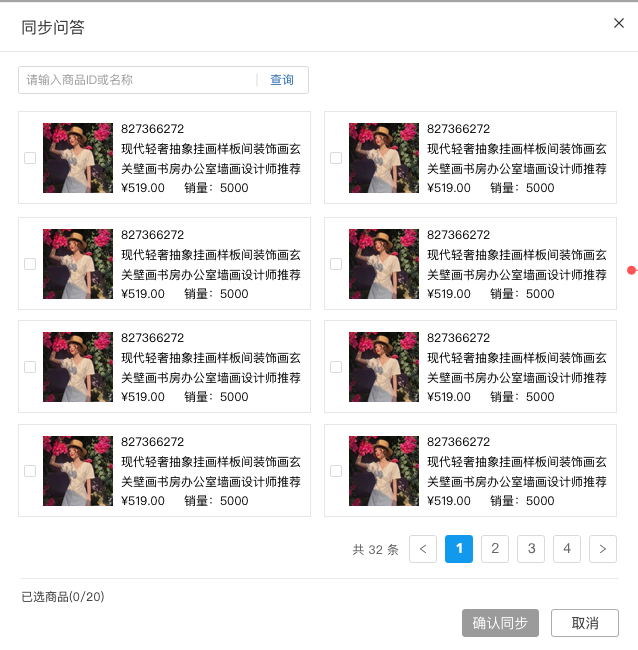 7,服务类问答可同步至其它商品,点击【同步】按钮,出现弹窗。弹窗展示可同步的商品,可单选、多选当前页所有商品;当选满20件商品时,其它商品的勾选框将不能再选择。